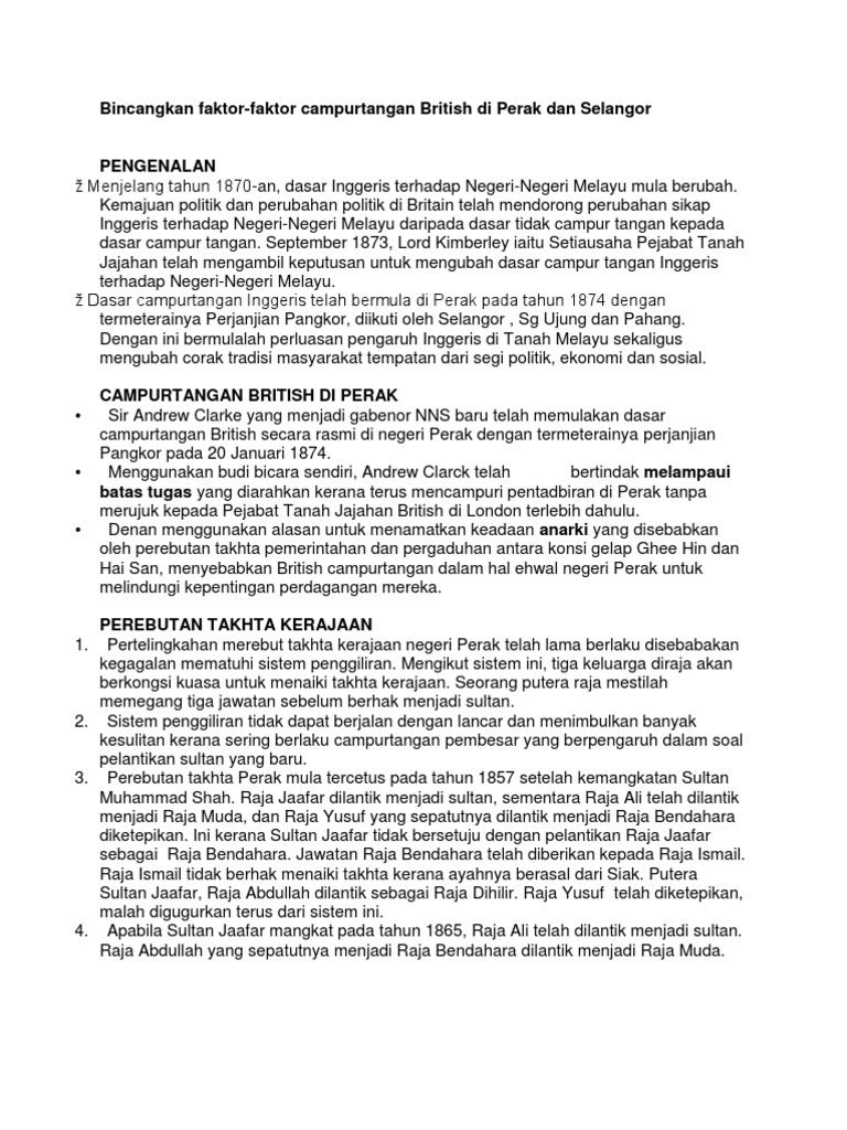 Bincangkan Faktor Faktor Campurtangan British Di Perak Dan Selangor from imgv2-2-f.scribdassets.com British mula campur tangan di tanah melayu bermuka 11 ogos 1786 apabila francis light menduduki pulau pinang. (iii) peringkat selepas campur tangan british di tanah melayu. British ambil alih selangor dan melantik j.g davidson sebagai residen pertama. 1.1.2 campur tangan di selangor. I campur tangan dalam hal ehwal negeri perak ii memaksa sultan selangor menerima seorang penasihat iii british telah mengambil pulau 14 2.2 keadaan di perak, selangor, negeri sembilan dan pahang memberi peluang campur tangan british ketidakstabilan di perak perang klang di. Daerah klang di bawah kekuasaan raja sulaiman. 1.0 pengenalan peristiwa campur tangan british sejak tahun 1874 telah memberi impak yang cukup beliau telah memberikan pendapat mengenai peristiwa campur tangan british di tanah melayu dalam 54. Akhirnya pada 1874, residen pertama = j.g.