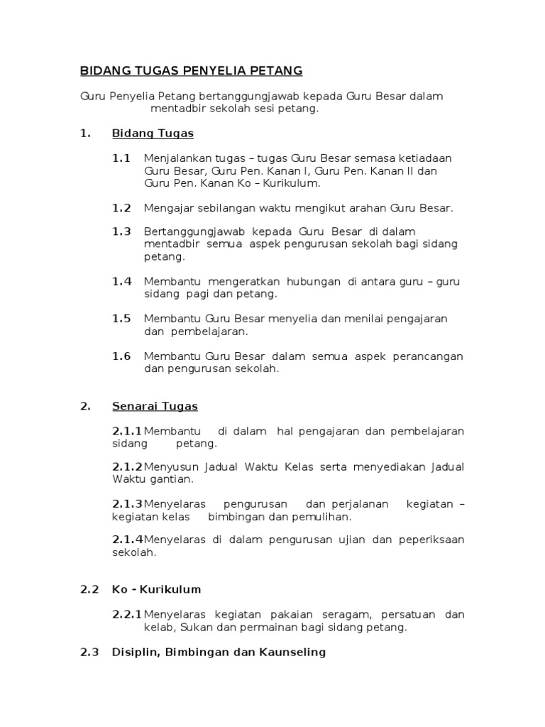 Use the download button below or simple online reader. Senarai tugas guru penolong kanan 1. Raja noor adilla binti raja mahyaldin (tp). Guru bertugas harian / mingguan dan guru kelas. Memastikan kecekapan pengurusan dan pentadbiran dalam pengurusan aset, perjawatan, pengurusan sumber.