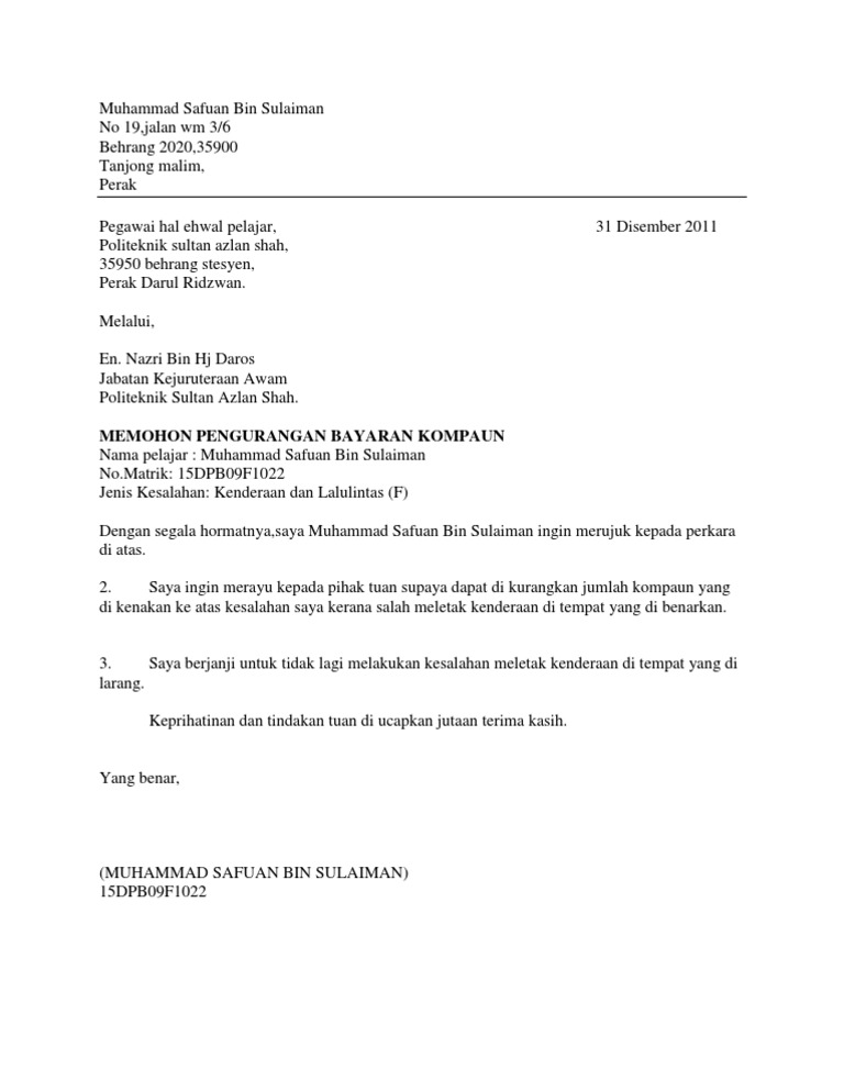 Tarikh mungkin akan lari sikit. Pertanian, jurusan master sains agronomi memohon penangguhan bayaran yuran. Format dia adalah berdasarkan contoh surat rayuan rasmi yang kami pernah tulis. Documents similar to contoh surat rayuan pengurangan bayaran akpk. Diskaun / pengurangan bayaran balik pinjaman boleh ubah via ibumifzal.com.